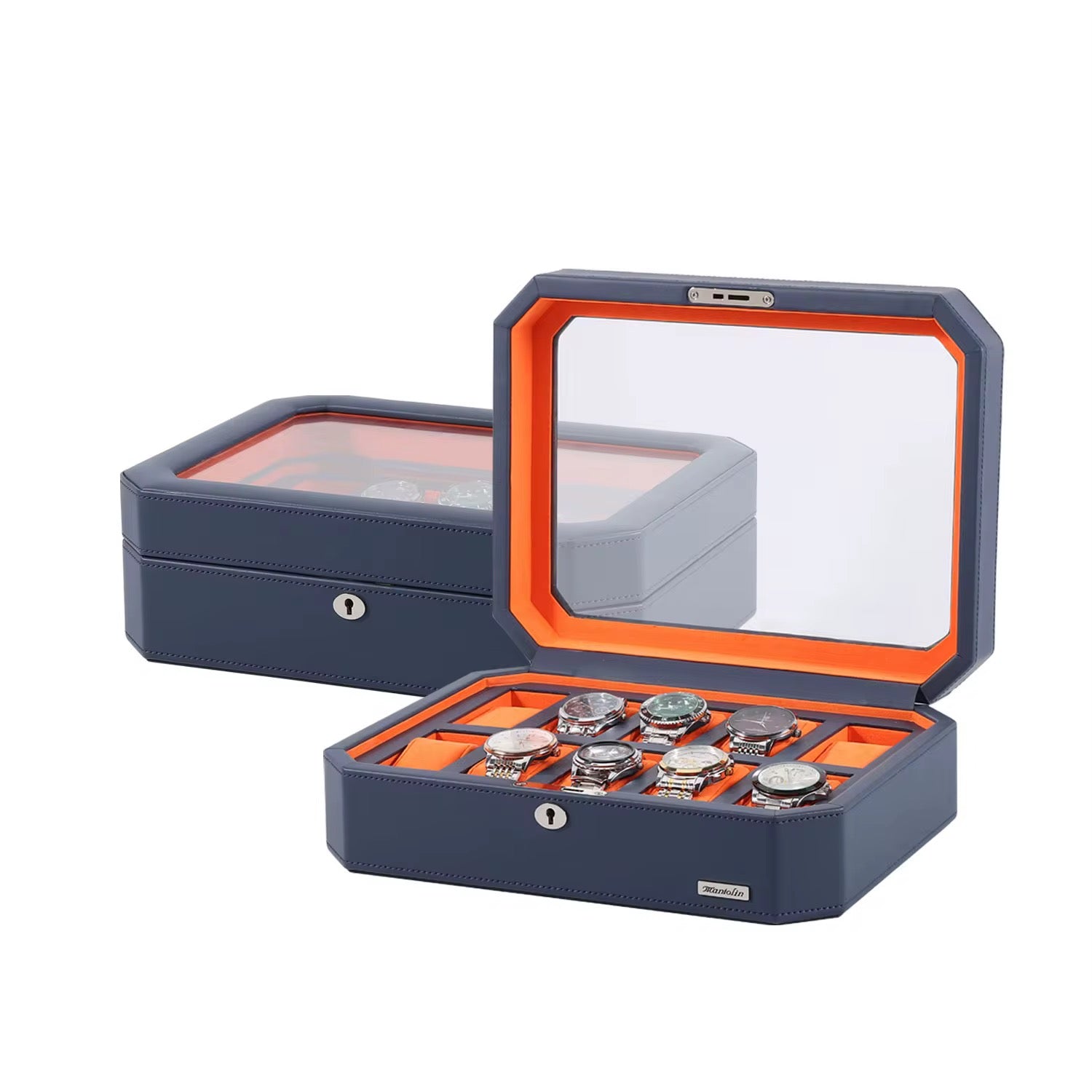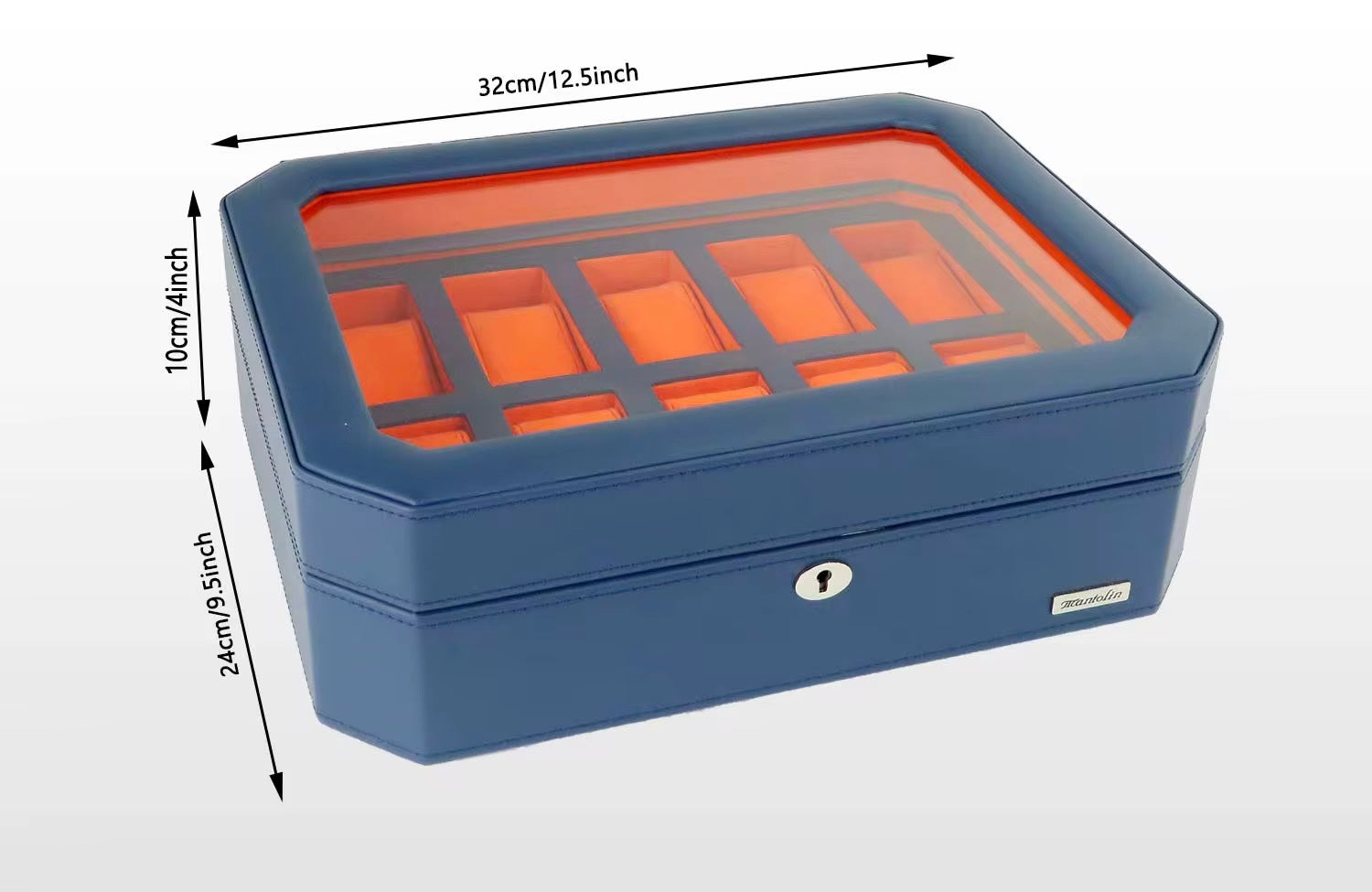 Safely store and showcase up to 10 watches at once with our stylish blue leather and suede orange case.